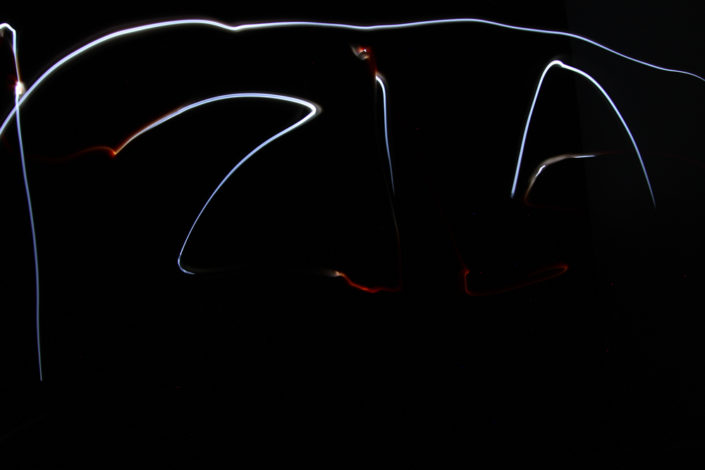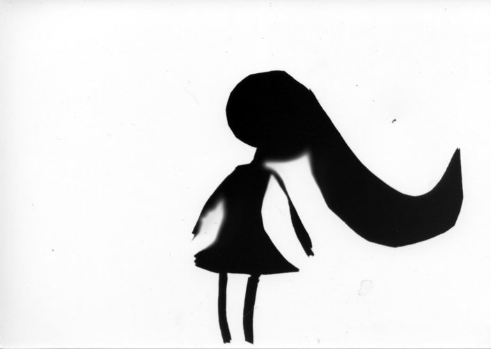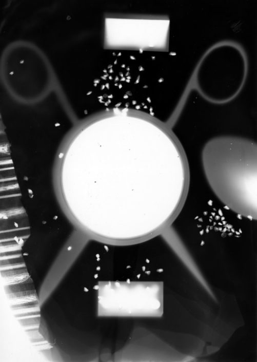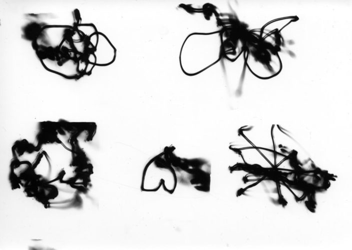 On rentre dans la chambre noire et on fait des premiers essais avec des simples silhouettes découpées dans du carton. C’est notre premier photogramme! Le photogramme est une image photographique obtenue sans utiliser un appareil photographique, en plaçant des objets sur une surface photosensible (papier photo) et en l’exposant ensuite directement à la lumière.