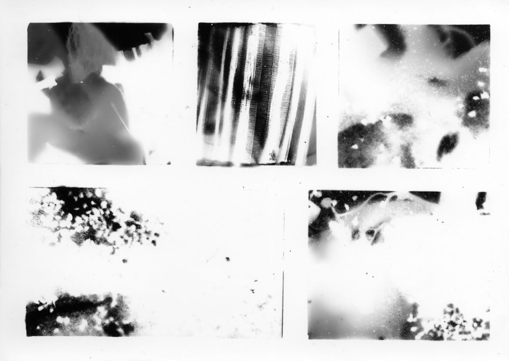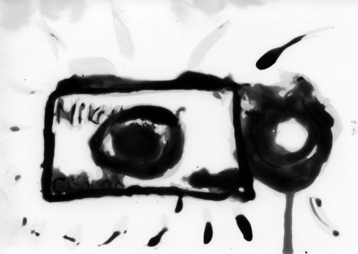 On commence par dessiner avec du révélateur (liquide chimique transparent) sur du papier photosensible en choisissant comme sujet quelques appareils photo posés sur la table. C’est un dessin à l’aveugle. Le résultat surprise n’est visible qu’après développement…