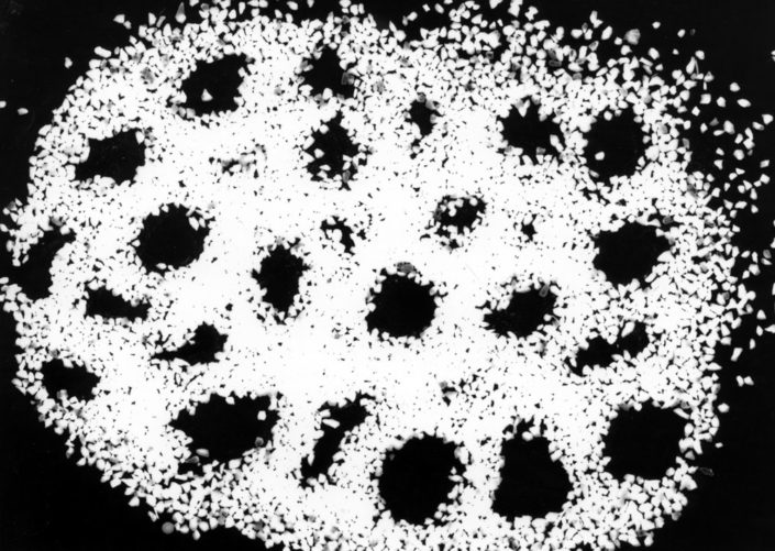 Dans la chambre noire on s’amuse avec toute sorte de matériaux (différents types de sable, végétaux, papiers, tissus, plastiques, objets…) pour réaliser des photogrammes plus élaborés.